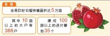 歷經(jīng)了10多年的選育、種植、示范,永勝縣的軟籽石榴產(chǎn)業(yè)已初具規(guī)模。目前,全縣軟籽石榴種植面積達(dá)5萬(wàn)畝,其中種植面積在10畝以上的大戶有388戶,建成100畝以上的連片基地35個(gè)。