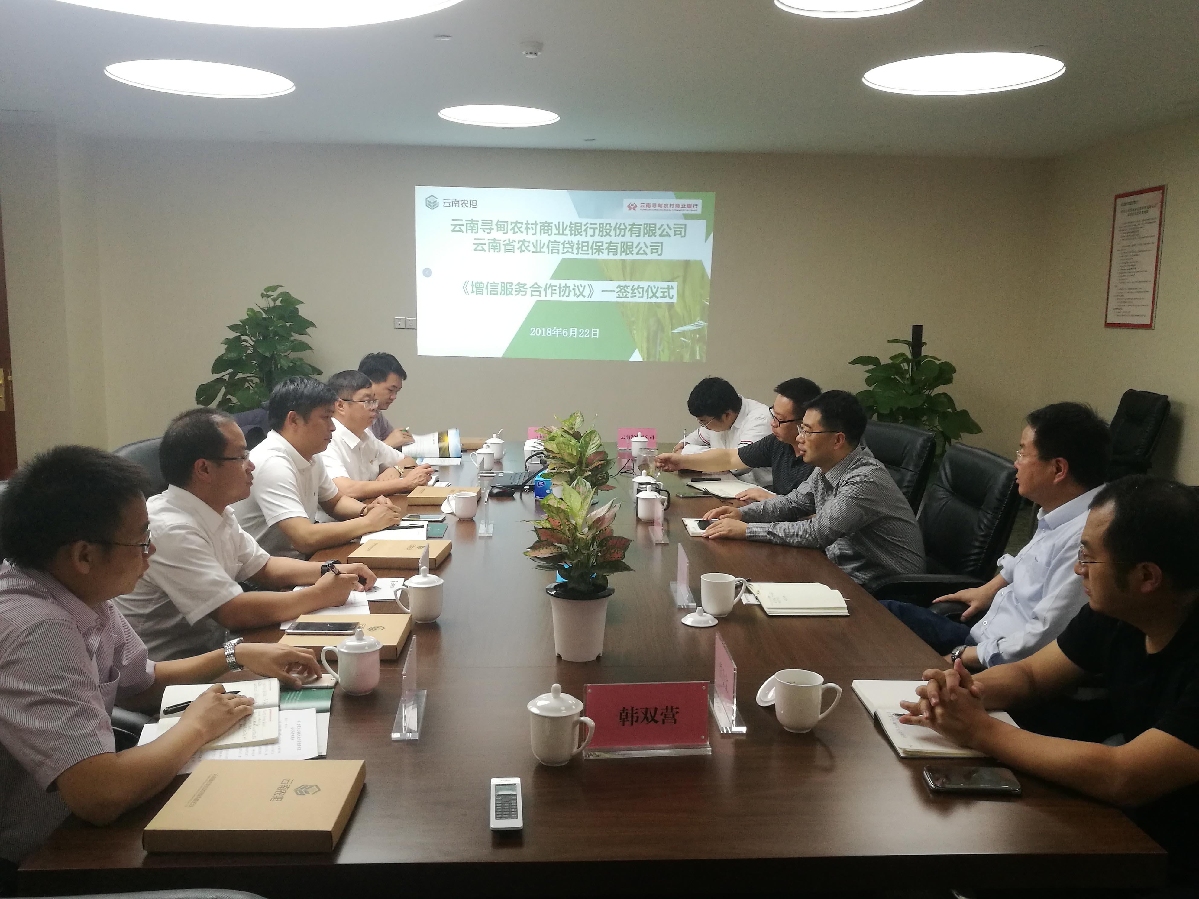 6月22日下午,為認真貫徹落實《中共中央 國務院關于實施鄉(xiāng)村振興戰(zhàn)略的意見》(中發(fā)〔2018〕1號)和省委、省政府關于發(fā)展“三農(nóng)"的決策部署,緊緊圍繞“一村一品、一縣一業(yè)”發(fā)展新格局,為緩解新型農(nóng)業(yè)經(jīng)營主體融資難、融資貴的問題,遵循合作共贏理念,整合各自優(yōu)勢,構(gòu)建銀擔聯(lián)合創(chuàng)新、聯(lián)合推動、風險共擔,省農(nóng)擔公司與尋甸縣農(nóng)村商業(yè)銀行本著互惠互利、讓利于農(nóng)的原則,由尋甸農(nóng)商行董事長虞燕林帶隊、行長李葉忠、副行長范彪等一行前往省農(nóng)擔公司與董事長郭影、總經(jīng)理杜開波、副總經(jīng)理廖寅皓、農(nóng)擔二部負責人賈萬文等進行會談,會議期間雙方簽署了尋甸縣增信服務合作協(xié)議,為下一步業(yè)務開展打下了堅實的基礎。