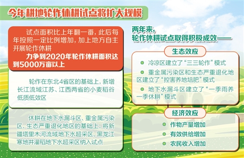 在2月23日的農(nóng)業(yè)部新聞發(fā)布會(huì)上,農(nóng)業(yè)部種植業(yè)司司長(zhǎng)曾衍德表示,今年我國(guó)耕地輪作休耕試點(diǎn)將擴(kuò)大規(guī)模,試點(diǎn)面積比上年翻一番,此后每年按照一定比例增加,加上地方自主開(kāi)展輪作休耕,力爭(zhēng)到2020年輪作休耕面積達(dá)到5000萬(wàn)畝以上。同時(shí),還將實(shí)現(xiàn)區(qū)域拓展。輪作在東北四省區(qū)的基礎(chǔ)上,新增長(zhǎng)江流域江蘇、江西兩省的小麥稻谷低質(zhì)低效區(qū);休耕在地下水漏斗區(qū)、重金屬污染區(qū)、生態(tài)嚴(yán)重退化地區(qū)的基礎(chǔ)上,將新疆塔里木河流域地下水超采區(qū)、黑龍江寒地井灌稻地下水超采區(qū)納入試點(diǎn)范圍。