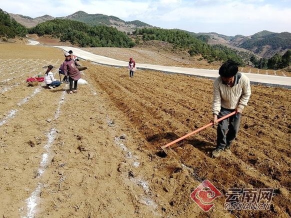 “老張,你家劃線行間距很標(biāo)準(zhǔn),技術(shù)掌握很到位嘛!有了威芋5號(hào)這個(gè)新品種,只要中耕管理到位,洋芋畝產(chǎn)量有望突破5000斤,要實(shí)現(xiàn)翻番沒(méi)問(wèn)題?!彪S同采訪的水磨鎮(zhèn)農(nóng)技站技術(shù)員劉飛高聲說(shuō)道。 “謝謝你們的技術(shù)指導(dǎo),開(kāi)溝劃線嚴(yán)格按照標(biāo)準(zhǔn)做的,后期管理還要來(lái)請(qǐng)教你們!” 水磨鎮(zhèn)滴水村村民張興周手持鋤頭忙得滿頭大汗?!敖衲晡壹?0畝坡地全部種洋芋,鎮(zhèn)里不僅免費(fèi)提供種薯,還派來(lái)技術(shù)員作指導(dǎo),再加上合作社提供的保障,今年一定有個(gè)好收成!”張興周樂(lè)呵呵地說(shuō)。