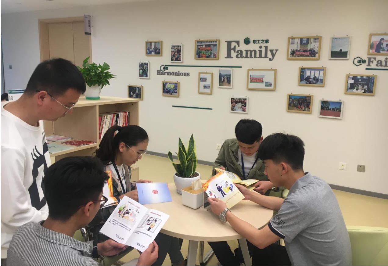 公司員工在讀書角認真閱讀國家安全工作宣傳手冊