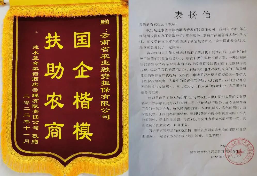 11月16日,云南省農(nóng)業(yè)融資擔保有限公司收到擔保客戶建水藍舍旅宿酒店管理有限責(zé)任公司送來的一封表揚信和一面印有“國企楷模 扶助農(nóng)商”的錦旗,表達對云南農(nóng)擔公司助企紓困的感激之情。